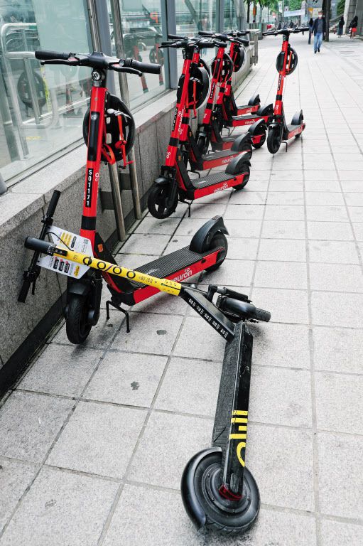 ▲24日午前、ソウル市江南区の宣陵駅近くで、歩道に電動キックボードが数台止まっていた。ヘルメットをかぶらずに電動キックボードに乗った場合、過料を科す法律が施行されて以降、電動キックボード利用客は急減している。写真=コ・ウンホ記者