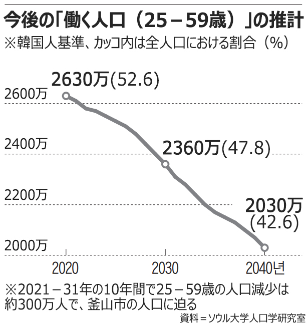 「今後10年」が重要だというもう一つの理由は、少子化の長期化で人口構造が変化し、25-59歳のいわゆる「働く人口」が急減するからだ。同研究室の予測では、25-59歳は今年の2610万人前後から徐々に減少し、2027年には全人口(韓国人基準)に比べ50%を切り、2031年には2310万人前後と、今後10年間で約300万人減少するという。生産・消費・投資に活発に貢献する経済主軸世代(25-59歳)が10年以内に釜山市の人口(337万人)くらいまで減るということだ。このため、現在は幼児関連産業部門など社会の一部領域でしか実感がない「人口の絶壁」現象が、2031年には社会の全分野で実感させられるようになるということだ。