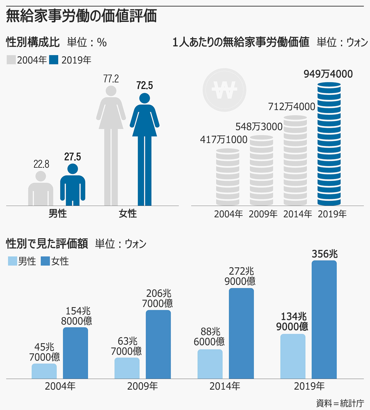 韓国統計庁は21日、2019年現在で家事労働の価値は490兆9000億ウォン(現在のレートで約47兆6300億円、以下同じ)、韓国の国内総生産の25%に達すると発表した。15歳以上の韓国国民1人当たり年間949万ウォン(約92万円)になる。性別で分けてみると、男女格差がひどい。男性はおよそ521万ウォン(約50万6000円)、女性は1380万ウォン(約133万9000円)だ。家事労働に従事する絶対時間に差があるからだ。韓国の女性は1日205分、男性は64分ほど無給の家事労働を行っている-と統計庁は明らかにした。