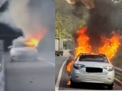 韓国で高速道路を走っていた電気自動車から火が出て車が全焼した。