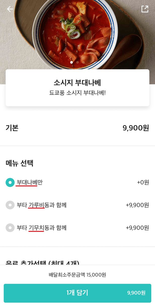 赤いヤンニョム(合わせ調味料)の汁に数種類のソーセージが入ったプデチゲを、この飲食店は「部隊鍋」と呼んでいた。「東京風」という説明も付け加えられていた。また追加メニューの選択欄には「豚カルビ丼と一緒に」「豚キムチ丼と一緒に」という項目が用意されていた。テジカルビの丼物と、豚肉のキムチポックムパプ(チャーハン)を追加できるオプションだ。