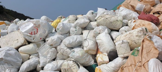 海岸から歩いて20分ほどの場所にある海岸ごみ集積場には大きめの麻袋が数百個積み上げられていた。集められたごみは1年に数回、船で陸地に運び出している。ペンニョン島、大青島、小青島の三つの島から搬出された海洋ごみは2018年には144トン、19年162トン、20年229トンと毎年増加している。海洋環境情報のサイトを確認すると、18年から21年前半までペンニョン島に流れ着いた海洋ごみのうち、外国のものはおよそ70%だ。日本や北朝鮮からのものもたまにあるが、ほとんど(95%)は黄河や揚子江下流、あるいは中国漁船から捨てられたごみが海流や風に乗ってやって来たものだ。
