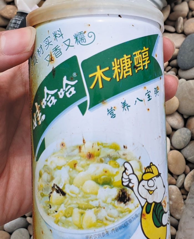 ペンニョン島のコントル海岸で拾った空き缶。中国の食品・飲料メーカー大手「娃哈哈」のかゆ飲料が入っていた缶だ。