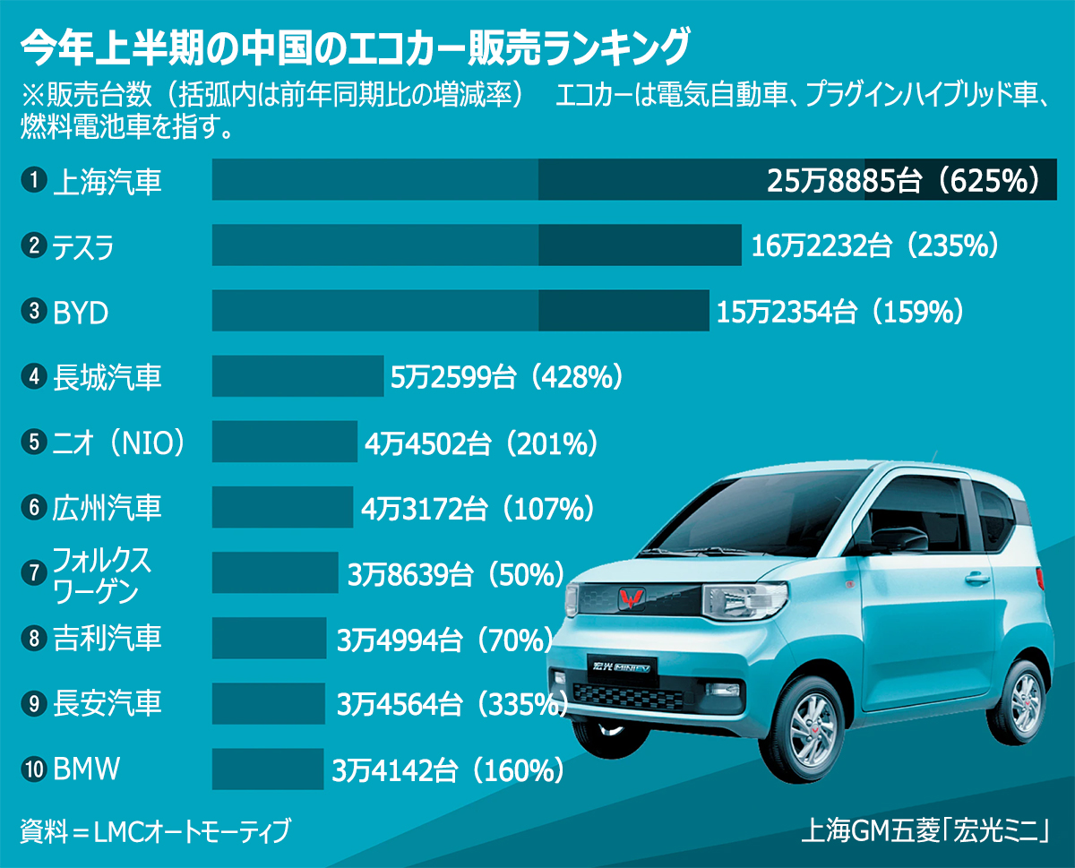 最近中国のエコカー市場では中国地場メーカーの活躍が目立つ。10位圏内に入ったメーカーのうち7社が中国メーカーだ。中国最大の国営自動車メーカー、上海汽車はエコカー販売が前年同期の7倍に増え、テスラを2位に追いやり、首位に立った。昨年上半期の11位から今年は4位に浮上した長城汽車を含め、3位から6位までを中国メーカーが占めた。