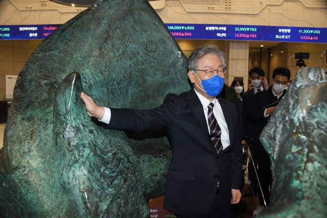 ▲証券市場活況の象徴…黄牛の角に触れる李在明候補。/写真=李徳薫(イ・ドクフン)記者