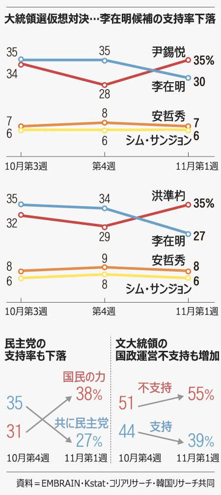 調査会社4社(EMBRAIN、Kstat、コリア・リサーチ、韓国リサーチ)が今月1日から3日にかけて実施した世論調査によると、与野党4党の各候補の仮想対決において、与党「共に民主党」の李在明候補は支持率が下落した一方、保守系最大野党「国民の力」の尹錫悦(ユン・ソクヨル)、洪準杓(ホン・ジュンピョ)候補はいずれも上昇した。まず、李在明(27%)、洪準杓(35%)、および「国民の党」の安哲秀(アン・チョルス、8%)、正義党のシム・サンジョン(6%)候補の対決では、先週の調査に比べ李候補の支持率が下がり(34%→27%)、逆に洪候補は上昇(29%→35%)してトップが入れ替わった。李在明(30%)、尹錫悦(35%)、安哲秀(7%)、シム・サンジョン(6%)候補の対決でも、李候補は支持率が下落(35%→30%)したのに対して、尹候補は上昇(28→35%)し、誤差の範囲内で李候補を上回った。「国民の力」の大統領選候補適合度を問う調査では洪準杓、尹錫悦候補がいずれも27%で同率となり、続いてユ・スンミン候補が10%、元喜竜(ウォン・ヒリョン)候補が3%だった。前の週に比べ尹候補は7ポイント、洪候補は2ポイント上昇した。