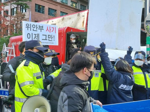 ソウル市鍾路区の旧日本大使館前にある慰安婦被害者を象徴する「平和の少女像」前では、進歩系の大学生団体「反安倍反日青年学生共同行動(反日行動)」と、保守系団体「自由連帯」が、警察の設置した規制線を挟んでそれぞれ集会を開い..