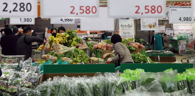 ▲量販店でキムチづくりの準備をする買い物客/17日、聯合ニュース