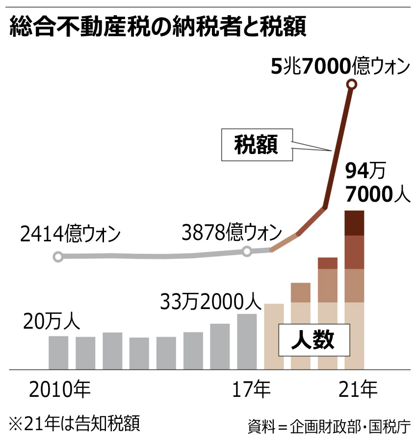 韓国企画財政部は22日、今年の住宅に対する総合不動産税の納税対象者が94万7000人(法人含む)になることを明らかにした。昨年(66万7000人)に比べ28万人(42%)も急増した。文在寅(ムン・ジェイン)政権が発足した2017年(33万2000人)よりも対象者が3倍に増えた。総合不動産税収は5兆7000億ウォン(約5500億円)で、昨年(1兆8000億ウォン)の3.2倍に増え、17年(3878億ウォン)と比較すると、14.7倍に膨らんだ。11年から10年間の総合不動産税収である5兆1000億ウォンよりも多い。