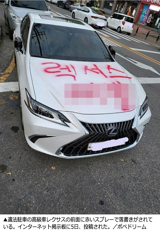 違法駐車された日本車に赤いスプレーで落書きがされている写真を巡り、韓国のインターネット上で論争が起きている。