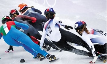 ▲2018年の平昌冬季五輪ショートトラック女子1000メートル決勝で、チェ・ミンジョン=写真左=と衝突した後、手を差し出す沈錫希(シム・ソクヒ)=同右=。写真=オ・ジョンチャン記者