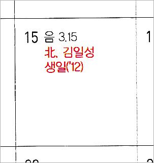 故・金日成(キム・イルソン)主席の誕生日も4月15日に赤字で表記されている。金正恩(キム・ジョンウン)国務委員長の誕生日も1月8日に「北、金正恩委員長誕生日(84)」と表記されているが、金日成・金正日とは違い黒字で書かれている。9月9日の「北、政権樹立日(48)」は赤字だった。