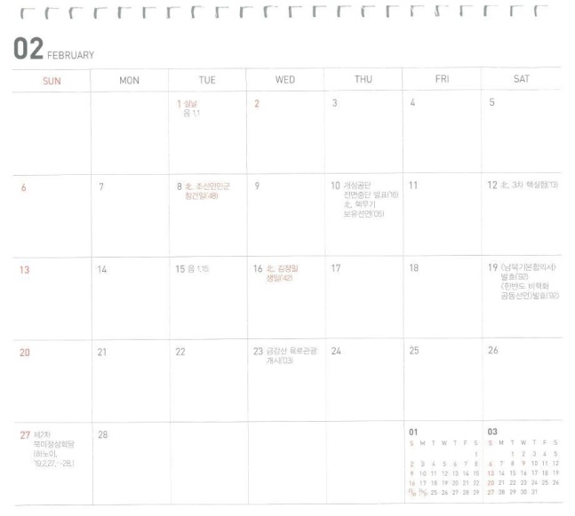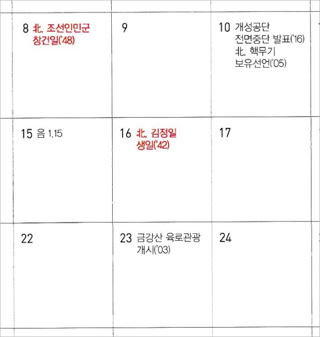 統一部が制作した来年の卓上カレンダーの2月をみると、火曜日の8日に「北、朝鮮人民軍創建日(48)」、水曜日の16日に「北、金正日誕生日(42)といずれも赤い字で記載されている。韓国で最大の祝日となる2月1日の「旧正月」と同じ赤い字だ。カッコ内の数は朝鮮人民軍が創建された1948年と金総書記が生まれた1942年を意味する。一方で2月10日の「開城工団全面中断発表(16)」「北、核兵器保有宣言(05)」、12日の「北、3回目の核実験(13)」、19日の「南北基本合意書発効(92)、韓半島非核化共同宣言発効(92)」などは黒字で表記されている。