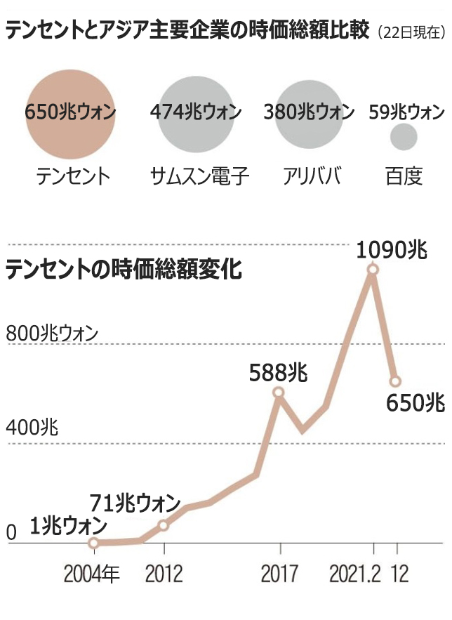 テンセントは11年、米国を代表するゲーム企業であるライオットゲームズに4700億ウォンを投資したのをはじめ、米エピックゲームズ(出資比率48%)、ゲーム「クラッシュ・オブ・クラン」で知られるフィンランド企業スーパーセル(84.3%)など世界的なゲーム企業を相次いで買収した。中国国内でも配送アプリ「大衆点評」(現・美団、20%)、中国2位の電子商取引サイト、京東(17%)、求人サイト「58同城」(19.9%)に大規模な出資を行い、インターネット企業世界大手に浮上した。