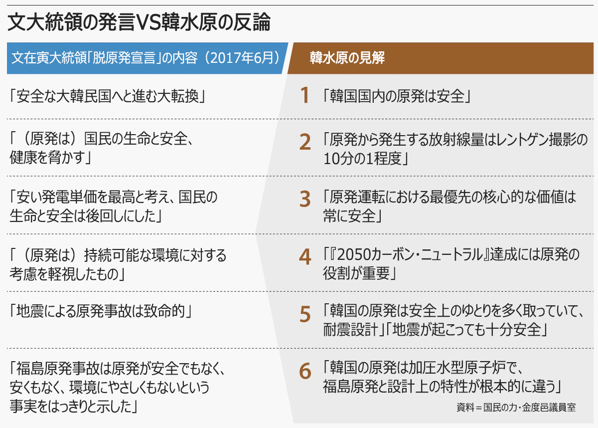文大統領が「エネルギー政策の転換」を強調して太陽光・海上風力発電を積極的に支援し、「国民の生命と安全、健康を脅かす要因を取り除かなければならない」とした発言についても、韓水原の見解は完全に異なる。「原発で発生する放射線量は(健康診断のための)レントゲン撮影時の10分の1程度に過ぎず、安全・健康を脅かす要素ではない」と説明した。また、原発は環境保全に有利なエネルギーであり、原発を「グリーンエネルギー」に分類する国際社会の動向も紹介した。このほど発表された、持続可能な経済活動の欧州連合(EU)独自基準「EUタクソノミー」草案で、原子力が「グリーンエネルギー」に含まれた点を挙げて、「2050カーボン・ニュートラル(炭素中立)を達成するには原発の役割が重要だ」と強調した。