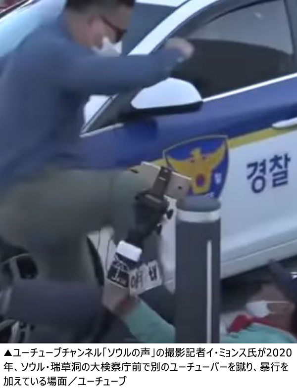 【写真】尹錫悦候補の妻キム・ゴンヒ氏の音声記録を公開した撮影記者がユーチューバーを蹴り、暴行を加えている場面(2020年)