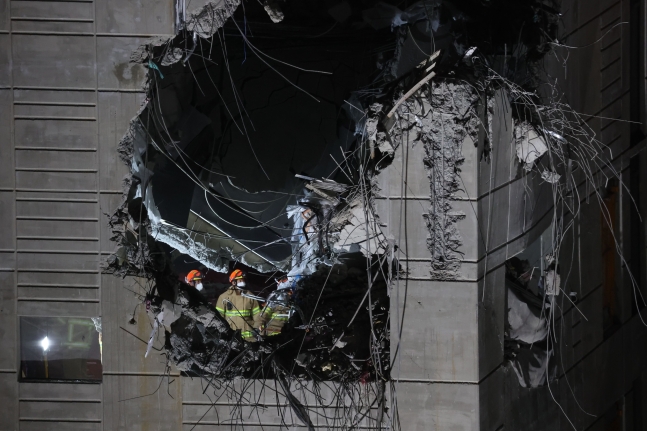 【写真】光州市西区のマンション「花井アイパーク」崩落事故の現場で、救急隊員が残がいの除去と捜索作業を進めている。/23日夜撮影、聯合ニュース