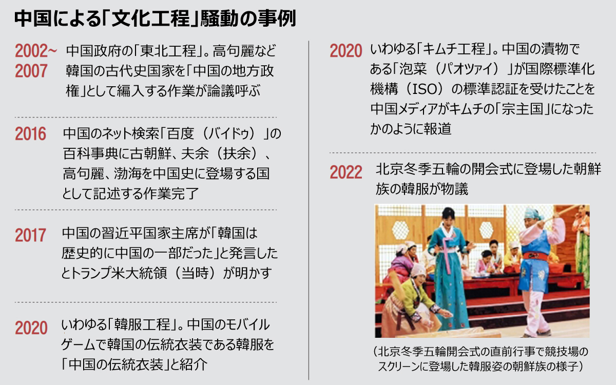 中国は2002年から07年にかけて公式に進めた「東北工程」を通じ、古朝鮮、夫余(扶余)、高句麗など韓国の古代史に登場する国家を「中国の地方政権」として歪曲する作業を進めた。07年にはある研究書に「百済と新羅も中国史の一部」と記述された事実も明るみに出た。17年にトランプ米大統領(当時)は習近平国家主席との会談後、「韓国は歴史的に中国の一部だ」と習主席が語っていたことを明かし、韓国人の反中感情を高めた。