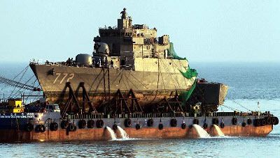 ▲海中から引き揚げられた哨戒艦「天安」がはしけに載せられ、韓国海軍第2艦隊(京畿道平沢市)に移送されている。/2010年4月24日、イ・ミョンウォン記者