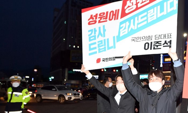 ▲「国民の力」の李俊錫代表が10日、光州市南区の白雲交差点で「声援に感謝いたします」と書かれたプラカードを持ち、大統領選の勝利に対する感謝のあいさつをしているところ。/写真=NEWSIS