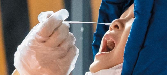 ▲光州市北区の選別診療所(検査所)で、新型コロナ検査を受ける子ども。韓国の新型コロナ累計感染者数は22日に1000万人を超えた。写真=キム・ヨングン記者