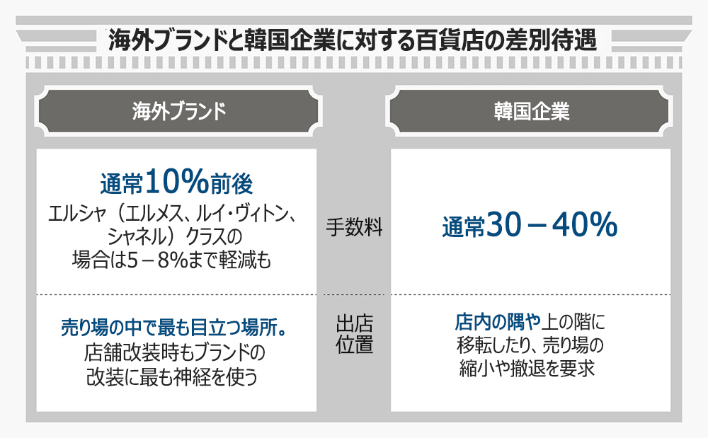 百貨店主要3社は海外ブランドに対し、一番良い場所を提供したり、手数料を大幅に引き下げたりしている。百貨店が海外ブランド企業から受け取る手数料は10%程度。「エルシャ」クラスは、それをさらに下回る5-8%程度だという。特定のイベント期間に目標販売額を超えると、手数料をさらに削減したり、さまざまなマーケティング・管理費用を減免したりするケースもある。国内企業から通常30-40%台の手数料を受け取るのとは対照的だ。ブランド業界関係者は「百貨店3社が先を争うように破格の入店条件を提示するため、むしろ入店をためらうほどだ」と話した。