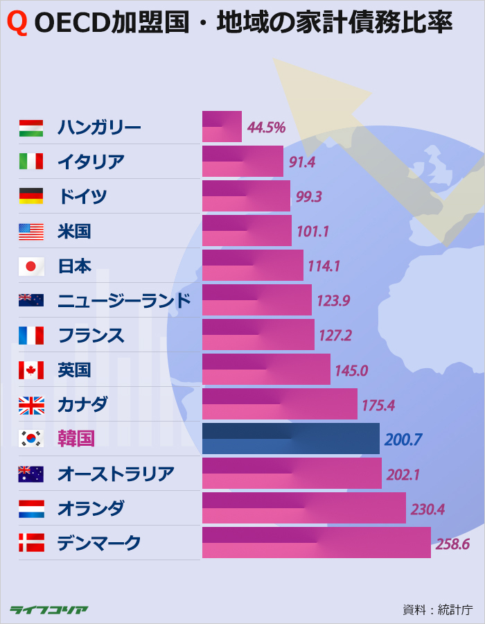 主要国・地域の米国(101.1%)、日本(114.1%)、フランス(127.2%)、英国(145.0%)などはこの比率が150%を超えていない。一方、オーストラリア(202.1%)、スイス(221.8%)、オランダ(230.4%)、ノルウェー(246.0%)、デンマーク(258.6%)などは韓国よりも高かった。