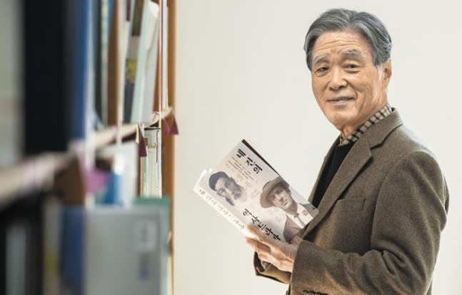 ▲ソウル市江南区の現代高校に整備された「鄭晋錫言論史料室」で、新著を手にする鄭晋錫教授。/写真=パク・サンフン記者
