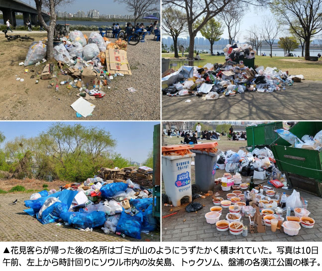 ソウルで桜をはじめとする春の花が満開になって迎えた週末の9日と10日、人々は各地で春を満喫した。そして、新型コロナウイルス流行以降で3年ぶりに開放された桜の名所・汝矣島の輪中路をはじめ、各地の漢江公園や蚕室の石村湖など、人が大勢集まる所はどこもゴミがあふれていた。漢江事業本部によると、4月3日から9日まで、汝矣島・盤浦・トゥクソムの各漢江公園から排出されたゴミの量は約62トンで、2週間前の3月20日から26日までの16トンに比べ4倍近く増えたとのことだ。