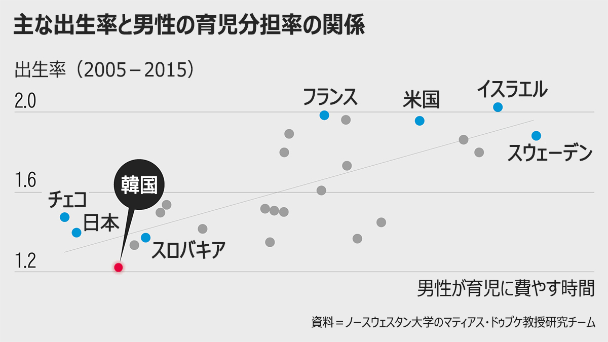 女性が仕事に就いたからといって出生率が低くなるわけではない。しかし、男性が育児と家事を減らせば減らすほど出生率は低下する。韓国は男性の育児分担率が日本やポーランドと共に低い3カ国の中の一つであり、出生率は最低だった。低出産を克服するためには、男性がより積極的に育児に参加しなければならないという意味だ。