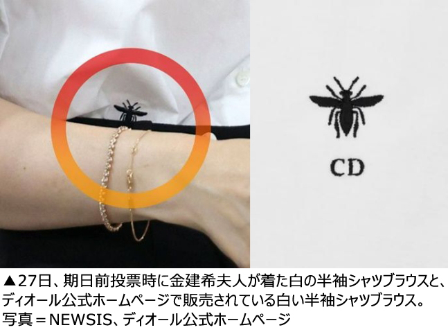この日も金建希夫人のファッションがインターネット上で話題を集めた。このシャツブラウスはディオールのアイテムとみられる。一見、無地のシャツブラウスに見えるが、細かなディテールが隠されている。シャツブラウスの右下の方を見ると、ディオールの象徴であるミツバチの刺しゅうが入っている。俳優ソン・ジュンギも昨年のグラビアでミツバチの刺しゅうが入ったディオールの白いシャツを着ていた。ディオールのミツバチ刺しゅう入り半袖シャツは現在、公式ホームページで175万ウォン(約18万円)で販売されている。
