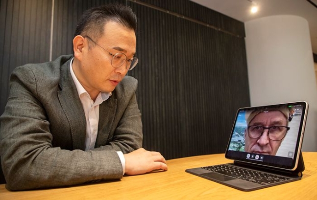 ▲ポスコ・インターナショナルのウクライナ・ミコライウ穀物ターミナルを率いるチェ・ハヨン法人長が、現地スタッフと動画通話をしているところ。/写真=パク・サンフン記者