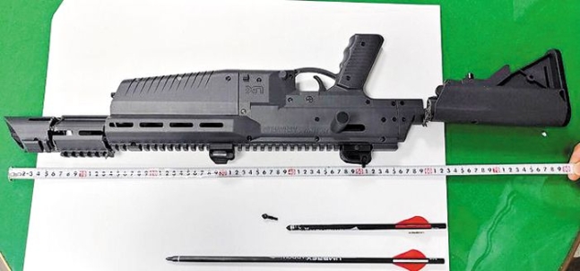 ▲6月30日、20代の男が全羅南道麗水市の鳳山派出所に矢を射ち込んだ際に使用したボーガン。/麗水署