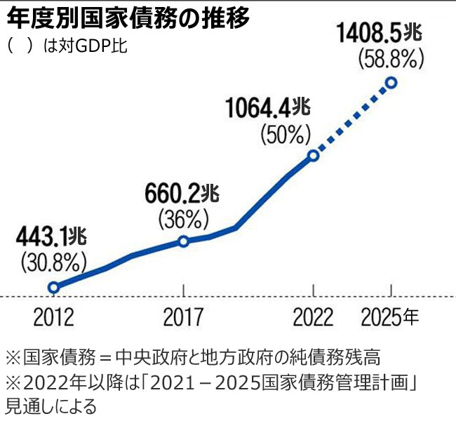国による債務の管理も強化される。2027年までに国の債務残高のGDP比を50%台中盤とする方向で管理を行うことにした。文在寅政権における債務増加のペースが続けば27年には債務残高のGDP比が68%にまで増加すると予想されている。