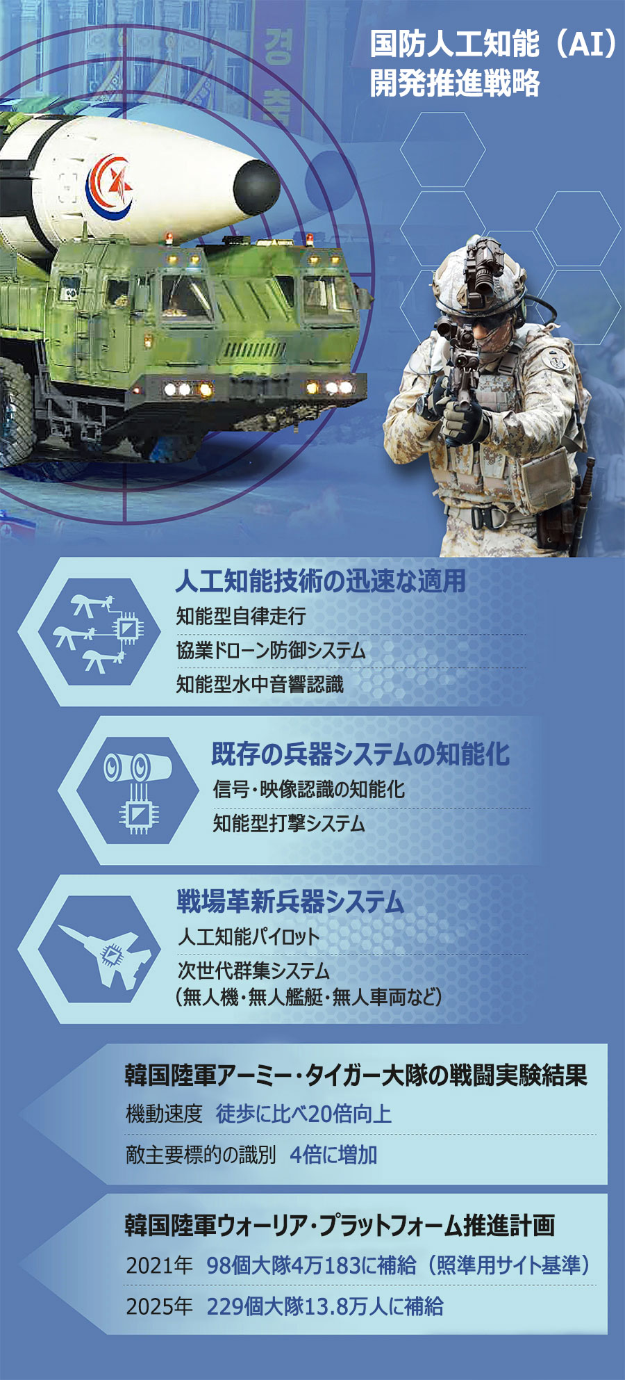 2018年から今年の末までの間に11万8000人の兵力が減って「兵力急減爆弾」を浴びた韓国陸軍はもちろん、海軍・空軍でも2-3年前から第4次産業革命技術の導入ブームが起きている。ここには国防AIをはじめビッグデータ、ドローン、ロボット、メタバース(仮想空間)、IoT(物のインターネット)、3Dプリンティングなどが網羅されている。中でも、常に真っ先に挙げられるのがAIだ。