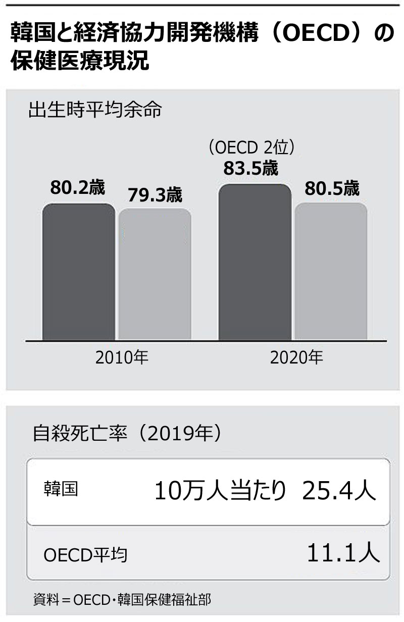 出生時平均余命は伸びているが、健康な生活ができないのも問題だ。統計庁によると、傷病のある期間(有病期間)を除いた「健康寿命」は2020年基準で66.3年にとどまり、2012年調査の65.7年に比べてほとんど改善されていなかったという。健康寿命とは、病気やけがで活動できなかった期間を引いた寿命の期間で、「どれだけ健康に長く生きられるか」に焦点を置いて算出した指標だ。韓国人の場合、出生時平均余命83.5年のうち17.2年は病気に苦しんでいるという意味だ。「体重過多と肥満」の人口は2020年基準で37.8%で、10年前の30.2%に比べ増えた。順天郷大学のキム・ヨンハ教授は「出生時平均余命世界1位の日本の場合、食べ過ぎを避けて運動をするなど、着実な健康管理が生活習慣化しており、『体の具合が悪くない高齢者』が一般化している」「一方、韓国は健康管理習慣が不十分で、長寿による医療費負担も相対的に高い」と指摘した。さらに、韓国の自殺死亡率は人口10万人当たり25.4人で、OECD平均(11.1人)の2倍超という圧倒的な1位だった。