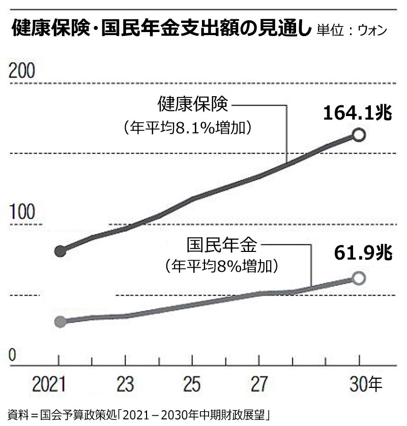 専門家らは「長寿が『のろい』ではなく『祝福』になるには、ますます悪化する福祉財政に対する改革が急がれる」と話す。国会予算政策処によると、少子高齢化による健康保険と国民年金の支出は、2021年から2030年までの10年間で、年間平均8%前後ずつ急速に増える見通しだという。2030年基準の健康保険支出は164兆ウォン(約17兆1310億円)、国民年金支出は61兆ウォン(約6兆3680億円)と予想されている。前政権の「文在寅(ムン・ジェイン)ケア」により2017年に62.7%だった健康保険保障率を2022年基準で70%にまで引き上げることを決め、「脳のMRI検査」などに健康保険が拡大適用されることになったため、財政が放漫になったとの指摘もある。