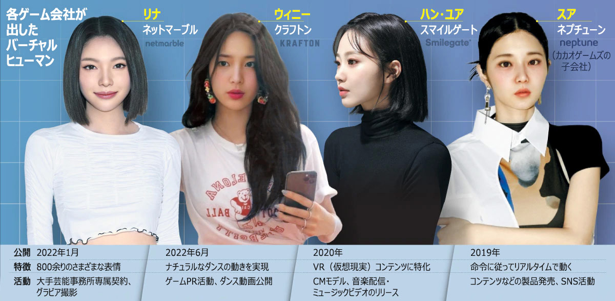 ゲーム・コミュニティー・サイト運営会社「ネットマーブル」の子会社「メタバース・エンターテインメントは今年初め、「リナ」というバーチャルヒューマン(仮想人間)を発表した。リナは800余りに及ぶさまざまな表情データを取り込んでいるのが特徴だ。何も言わずに静かにしているときも、本物の人間のように表情がしょっちゅう変わる。このような自然な表情が認められて今年3月、俳優ソン・ガンホらが所属する芸能事務所サブライムと専属契約を結んだ。ネットマーブルは年内にもバーチャルヒューマンによる4人組ガールズグループ「K-POPバーチャルアイドル」をデビューさせる予定だ。