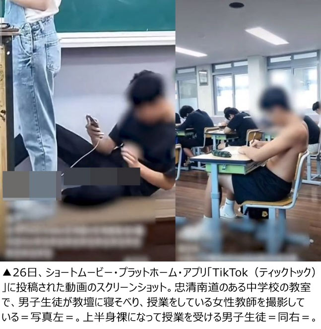 忠清南道のある中学校で男子生徒が授業中に教壇に寝そべり、スマホで女性教師を下から撮影しているような動画がネット上で拡散されて物議を醸している。26日にショートムービー・プラットホーム・アプリを通じて掲載された動画だ。教室には上半身裸になっている生徒もいた。それでも教師はそのまま授業を進めている。おそらく、やめるように言っても無駄だという無力感を抱いていたことだろう。そうしたことが日常的になっているものと思われる。教室が教師にとって恐怖の空間になっているのだ。