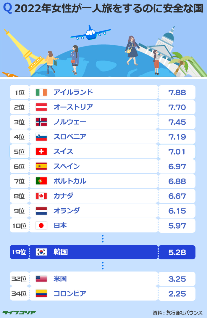 米CNBC放送は2日(現地時間)、「旅行会社バウンスが実施した『2022年女性が一人旅をするのに安全な国』という調査の結果、女性旅行者にとって最も危険な国はコロンビアで、次いでコスタリカ、米国、チリ、テュルキエ(トルコ)などだった」と報..