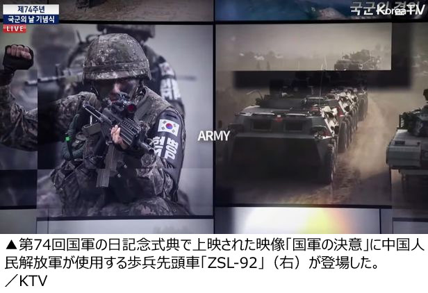 映像では陸軍を紹介する部分に装甲車のイメージが映し出されたが、これは韓国軍が使用する兵器ではなく中国人民解放軍の歩兵先頭車「ZSL-92」だった。行事後にSNS(交流サイト)などでは「不適切なイメージが使用された」との指摘が相次いだ。