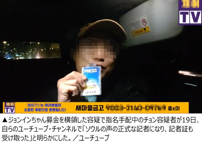養父母による虐待で死亡したジョンインちゃんのために集めた募金を個人的に使ったとして、一人のユーチューバーが指名手配された。このユーチューバーはインターネット・メディア「ソウルの声」のフリーランス記者だった。ユーチューバーは自らの指名手配が報じられたその日にユーチューブに出演し「ソウルの声の正式な記者になった」と伝えた。