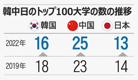 大学が他国の大学との共同研究をどれほど活発に行っているかを判断する指標でも、韓国の大学は苦戦した。今年の評価でも「国際研究協力」指標でアジア上位100位以内に入った韓国の大学は9校だけだった。中国は41校、日本は12校が名を連ねた。「外国人教員の割合」で韓国は8大学が100位圏内に入ったが、中国と日本はそれぞれ14校、13校だった。