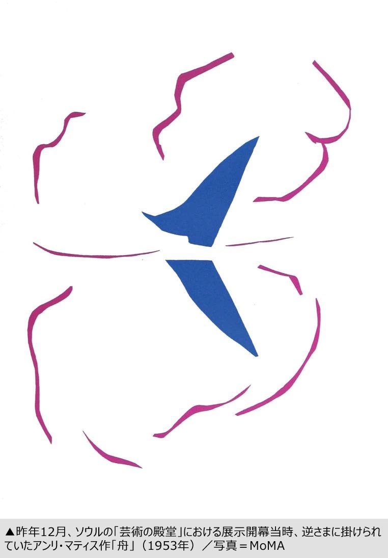昨年12月にソウルの「芸術の殿堂」で開かれた、フランスの野獣派の画家アンリ・マティスの展示でも、1953年の切り絵作品「舟(Le Bateau)」が逆さまに掛けられるというハプニングが起きた。相次ぐお粗末な展示の失態が、場合によっては美術と観客を遠ざけることになりかねない-という懸念も持ち上がっている。美術評論家のチャン・ジュンソク氏は「類似のミスが相次ぐようなら、現代美術に対する反感が大きくなる」とし「単なるチケット商売ではなく美術の底辺拡張に重要な影響を及ぼしている分、展示企画者は一層強い責任感を持つべき」と語った。現代美術はあいまいで変則的なケースが多いとはいえ、そうであればあるほど、作品提示における最低限の正確さは保証されるべき、というわけだ。