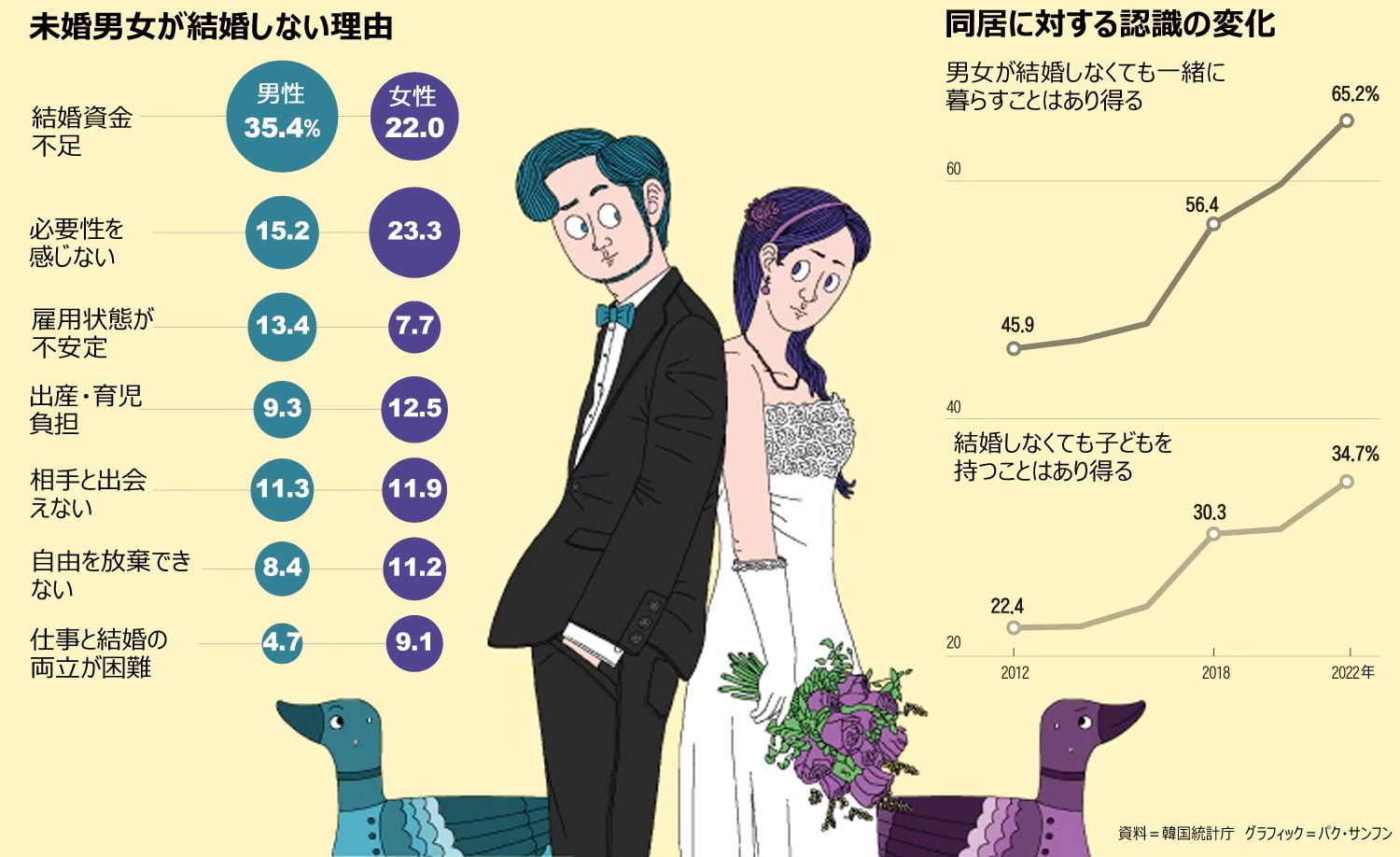 【グラフ】韓国の未婚男女が結婚しない理由と同居に対する認識の変化