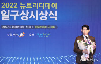 【NEWSIS】韓国プロ野球キウム・ヒーローズの李政厚(イ・ジョンフ)が、8日午前にソウル市内のホテル・リベラ・ソウルで開催された「2022 NUTRI D-DAY一球賞」授賞式で、最高打者賞を受賞した。写真は受賞後に心境を語る李政厚。
