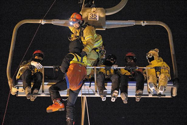 救助隊員がリフトの上に上がり、取り残されたスキー客にハーネス..