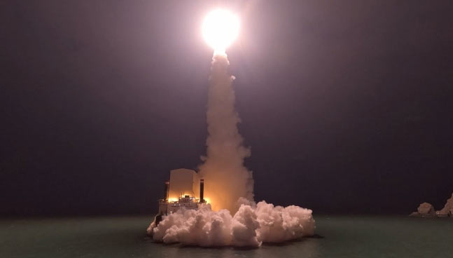 ▲先月30日、煙と炎を吹き上げて発射された固体燃料推進宇宙発射体(固体燃料ロケット)/写真=韓国国防省