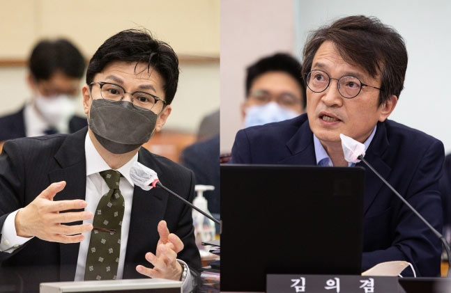 ▲韓東勲法相(左の写真)と、「清潭洞酒席疑惑」を提起した金宜謙「共に民主党」議員。