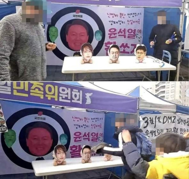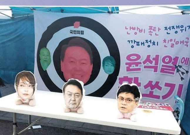 テーブルの上に人形が三つ置かれている。人形にはそれぞれ尹錫悦(ユン・ソンニョル)大統領、夫人の金健希(キム・ゴンヒ)氏、韓東勲(ハン・ドンフン)法務部長官の顔写真が貼られている。男性がおもちゃの弓で矢を放ち、韓長官の顔を当たると、人形はぱたりと後ろに倒れた。児童にもゲームに参加させ、中には脱いだ靴で人形を殴り倒した人もいた。「ろうそく行動」という団体が11日、ソウル中区太平路一帯で開いた「尹錫悦..